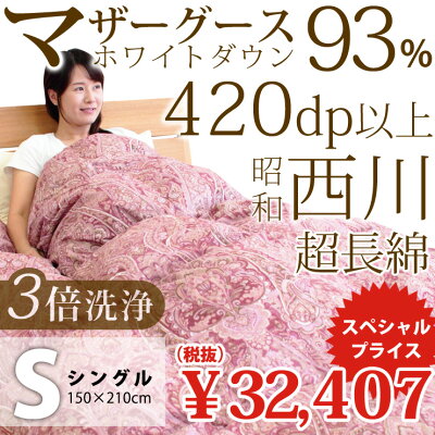マザーグース 羽毛布団 シングル 西川 布団カバー付 マザーホワイトグースダウン93% 1.1kg入り 420dp 羽毛掛け布団 羽毛ふとん 昭和西川 日本製 立体キルト 超長綿60サテン生地