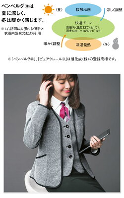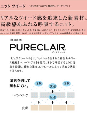 ■生地素材 : ニットツイード ■混率 : ポリエステル65% 綿30% キュプラ5% ■機能 ・ニット素材 ・4WAYストレッチ ・吸汗速乾 ・湿度コントロール ・マルチポケット ・調整ベルト ・スカーフループ ・ネームループ ・ホームクリーニング ■ピュアクレール 「ピュアクレール」は、コットンから生まれた再生セルロース繊維「ベンベルグ」を使用。